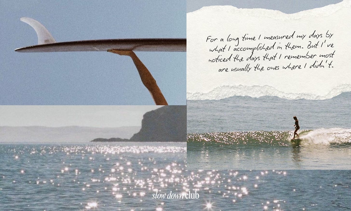 One morning I stood on the beach watching surfers (*see photo above). I didn’t bring my phone, and I wasn’t multitasking (ok except I did bring my camera but that doesn’t count). I just stood there longer than I normally let myself stand anywhere. There’s nothing to optimize about watching someone surf. You can’t help, you can’t speed it up, you can’t improve it by thinking harder. You just watch.
